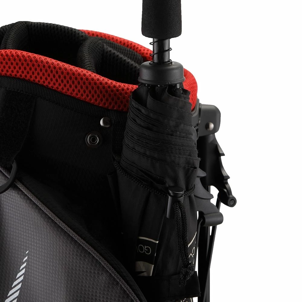 There’s also an external umbrella holder, 1 full length pockets for your apparel, 4 zipper pockets, a balls pocket, valuables pocket, velcro glove tab and more!